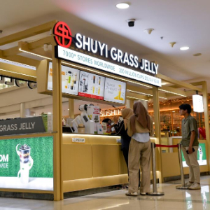 11月28日,在印度尼西亚德波,顾客在一家书亦烧仙草门店购买饮品。
