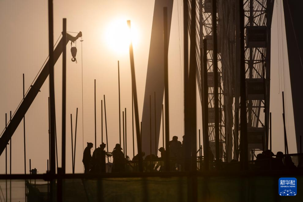 12月8日,工人在哈尔滨冰雪大世界主塔施工现场作业(无人机照片)。