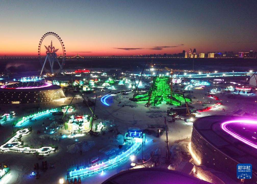 这是12月9日拍摄的哈尔滨冰雪大世界雪花摩天轮附近的施工场景(无人机照片)。