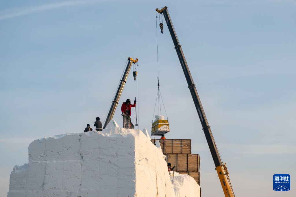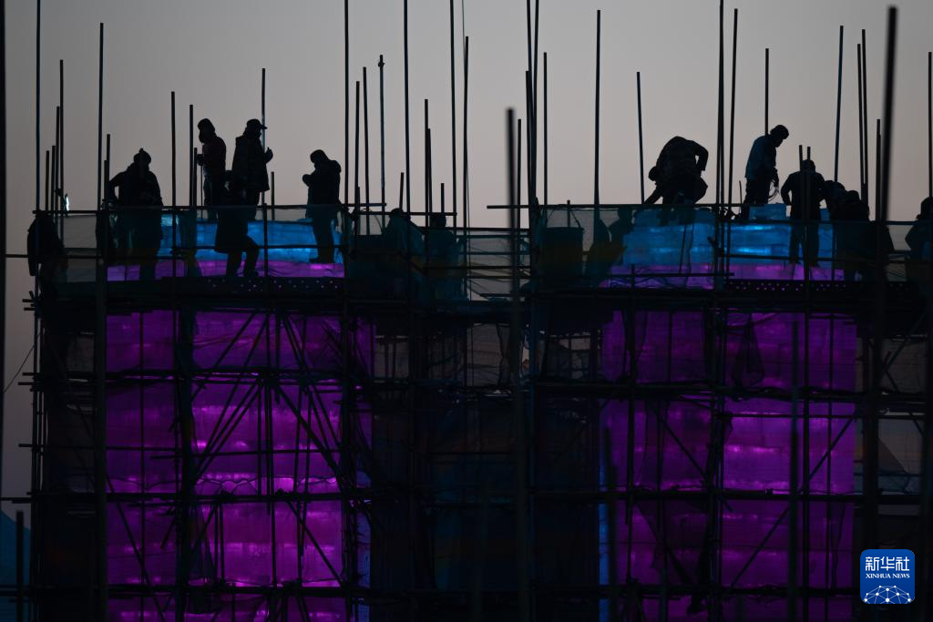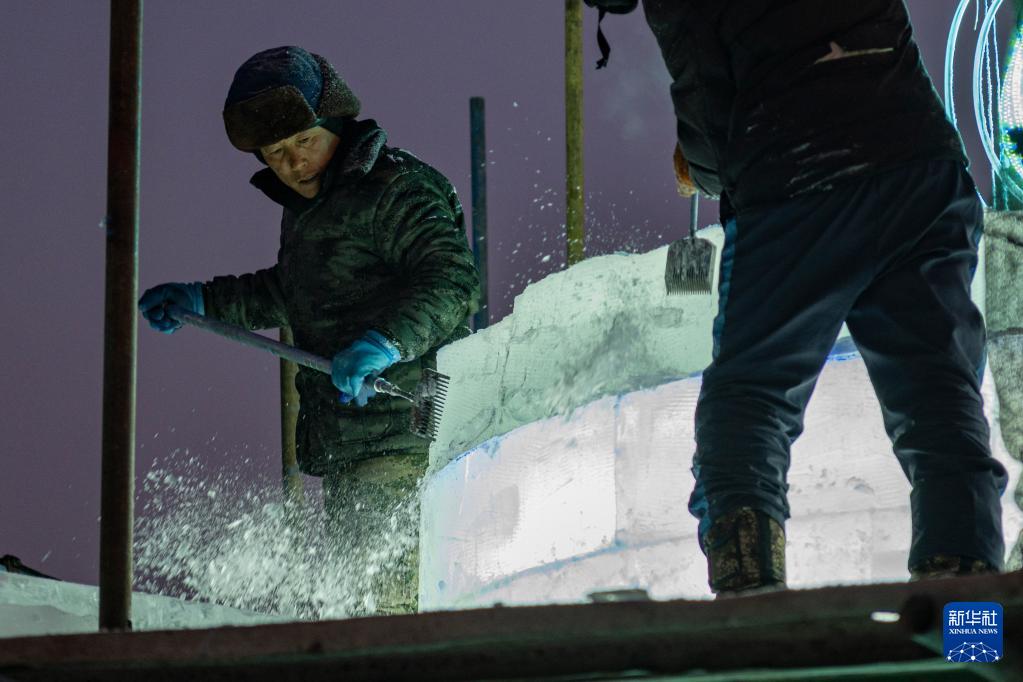 12月9日,工人在哈尔滨冰雪大世界冰建施工现场作业。