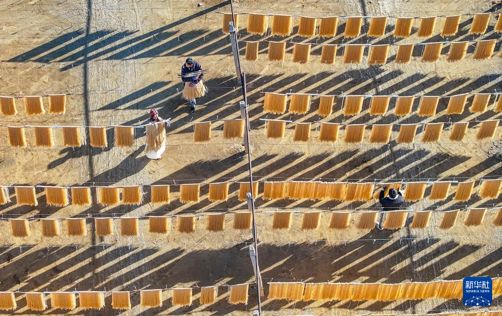 12月11日,农民在河北省遵化市新店子镇一家专业合作社的晒场晾晒手工粉条(无人机照片)。