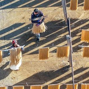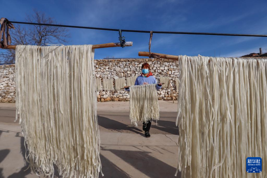 12月11日,河北省遵化市新店子镇万子峪村农民在庭院晾晒手工粉条。