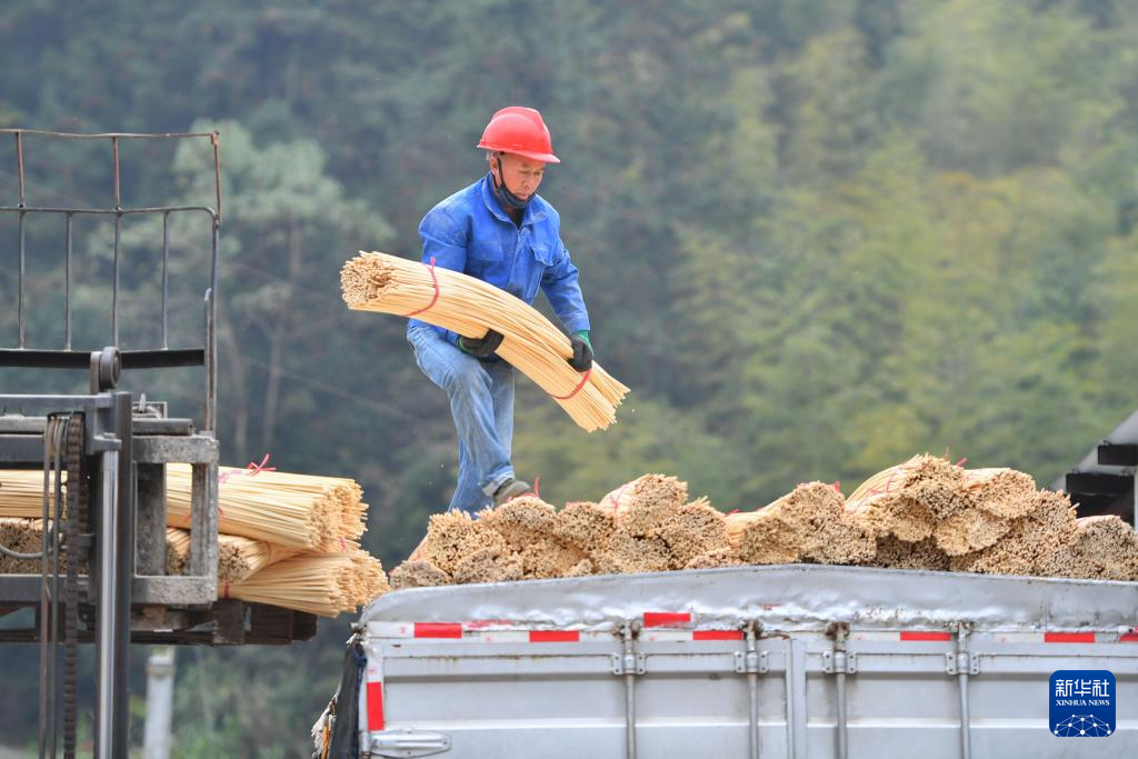 12月10日,村民在湖南省郴州市桂东县清泉镇桥头乡侠头村一家楠竹初加工企业将楠竹半成品装车。