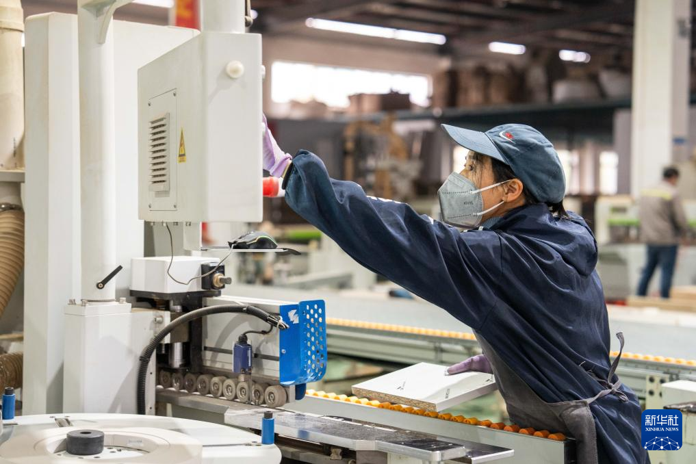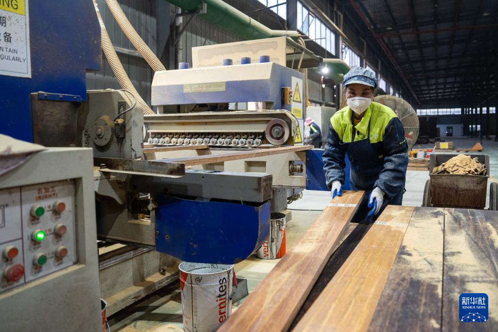 12月9日,在永州市双牌竹木产业科技园,湖南叁一科技有限公司的工人在竹木制品生产车间加工板材。