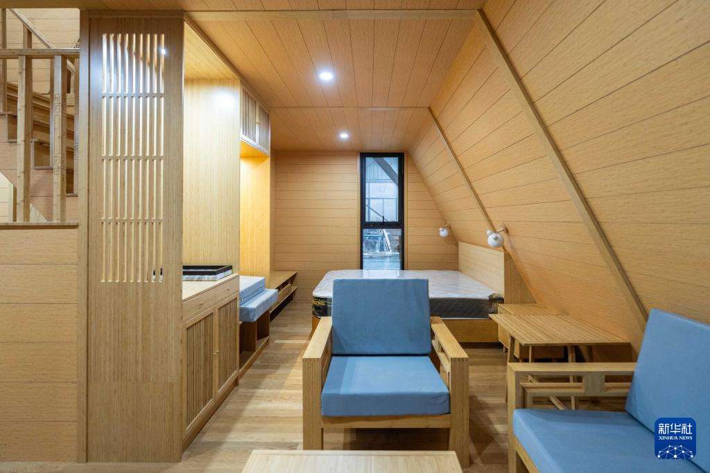 这是12月10日在永州市双牌竹木产业科技园的一家公司内拍摄的钢竹结构民宿内景。