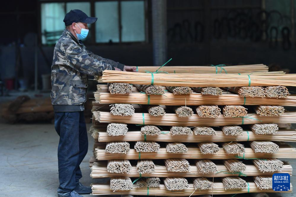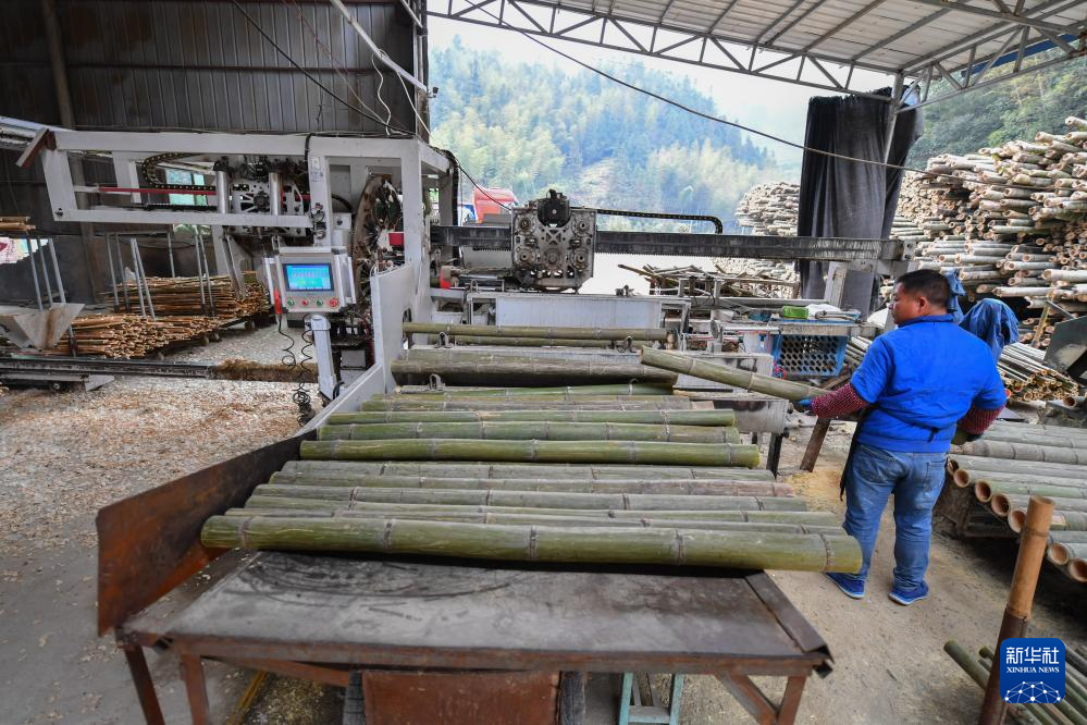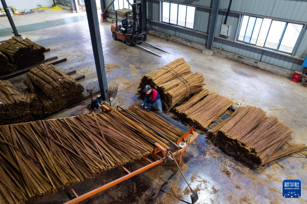 12月10日,村民在湖南省郴州市桂东县清泉镇桥头乡侠头村一家楠竹初加工企业整理拉丝后的楠竹。