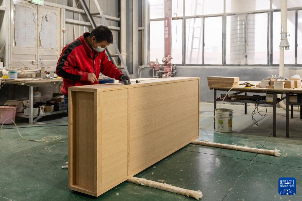 12月10日,在永州市双牌竹木产业科技园,湖南永竹竹业科技有限公司的工人在生产竹木家具。