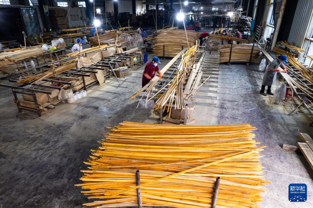 12月10日,在永州市双牌竹木产业科技园,湖南省有竹科技有限公司工人在加工竹条(无人机照片)。
