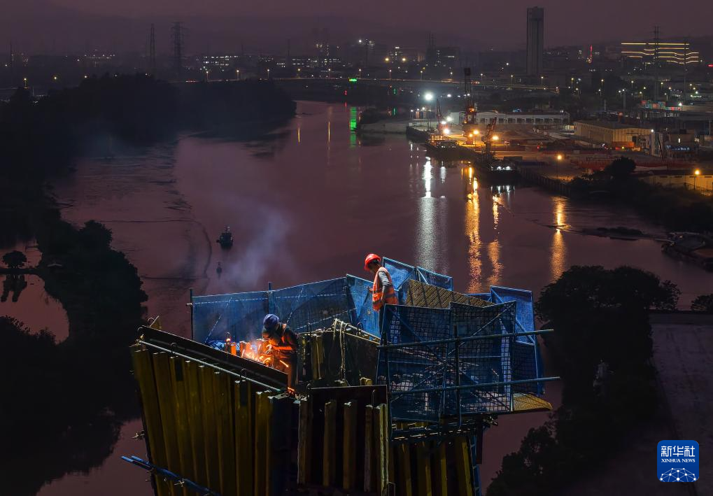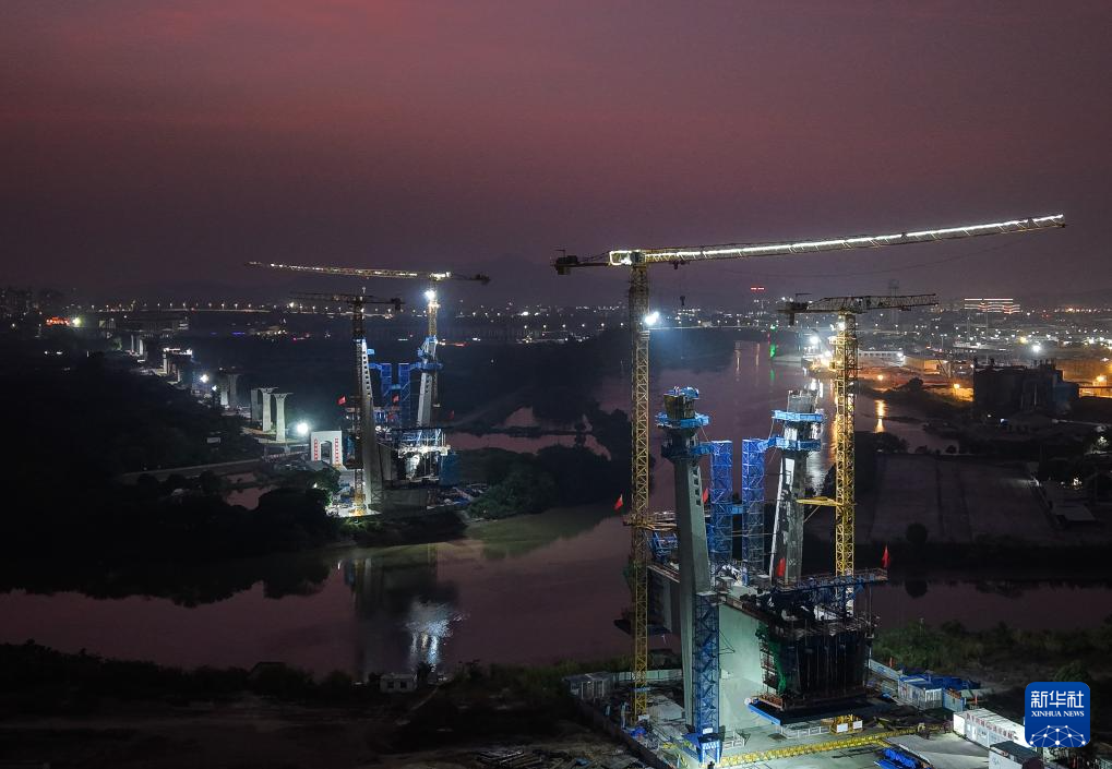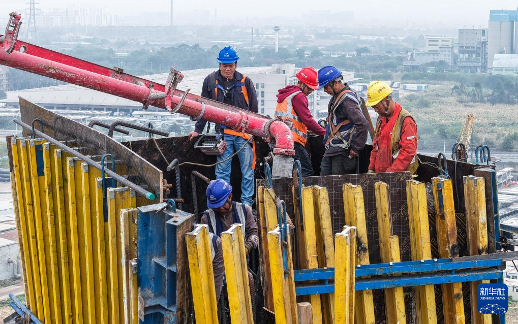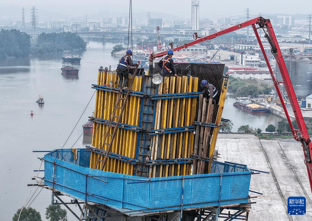 12月11日,施工人员在广佛西环线广州炭步白坭河特大桥主墩双索塔浇筑施工现场作业。