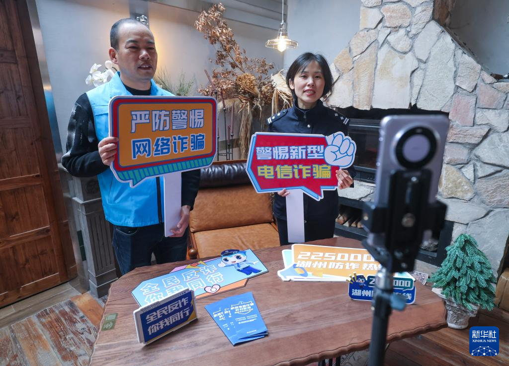 12月12日,道场乡网格员(左)和派出所民警在店铺内进行反诈直播。