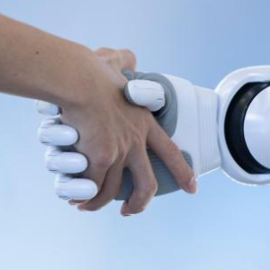 6月26日,在深圳市优必选科技股份有限公司总部,工作人员与熊猫机器人“优悠”握手。