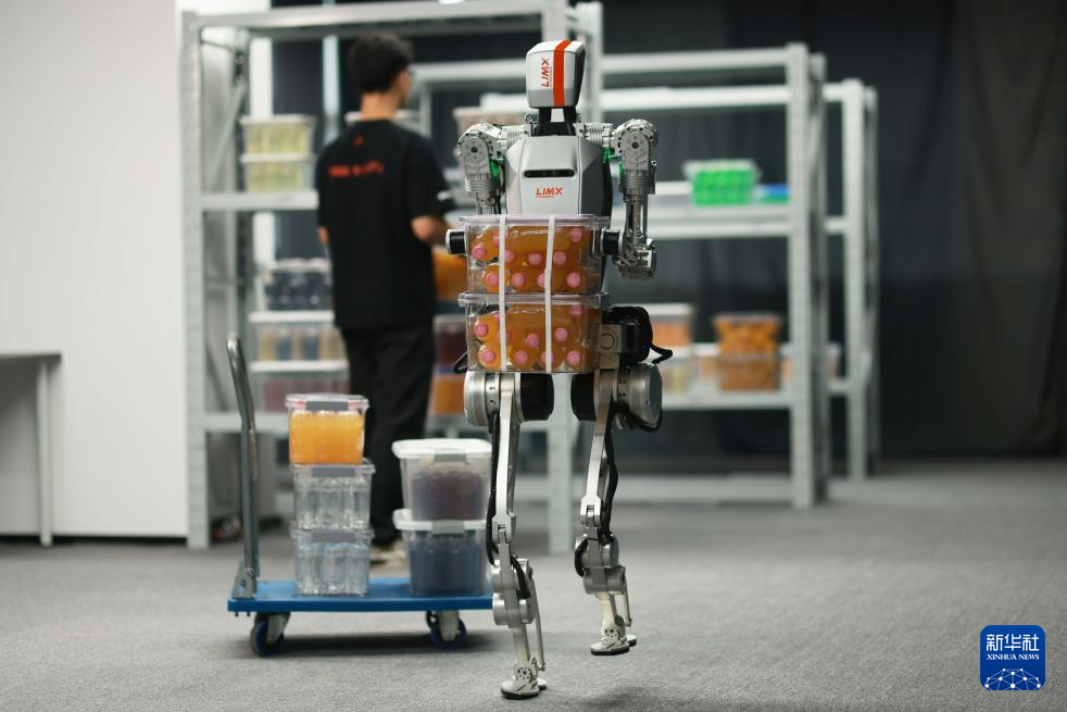 在深圳逐际动力科技有限公司,人形机器人CL-1进行大负载搬运任务(资料照片)。