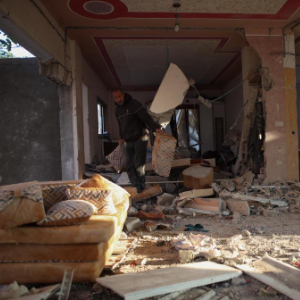 12月12日,在加沙地带中部努赛赖特难民营,一名男子清理以军轰炸后的建筑废墟。