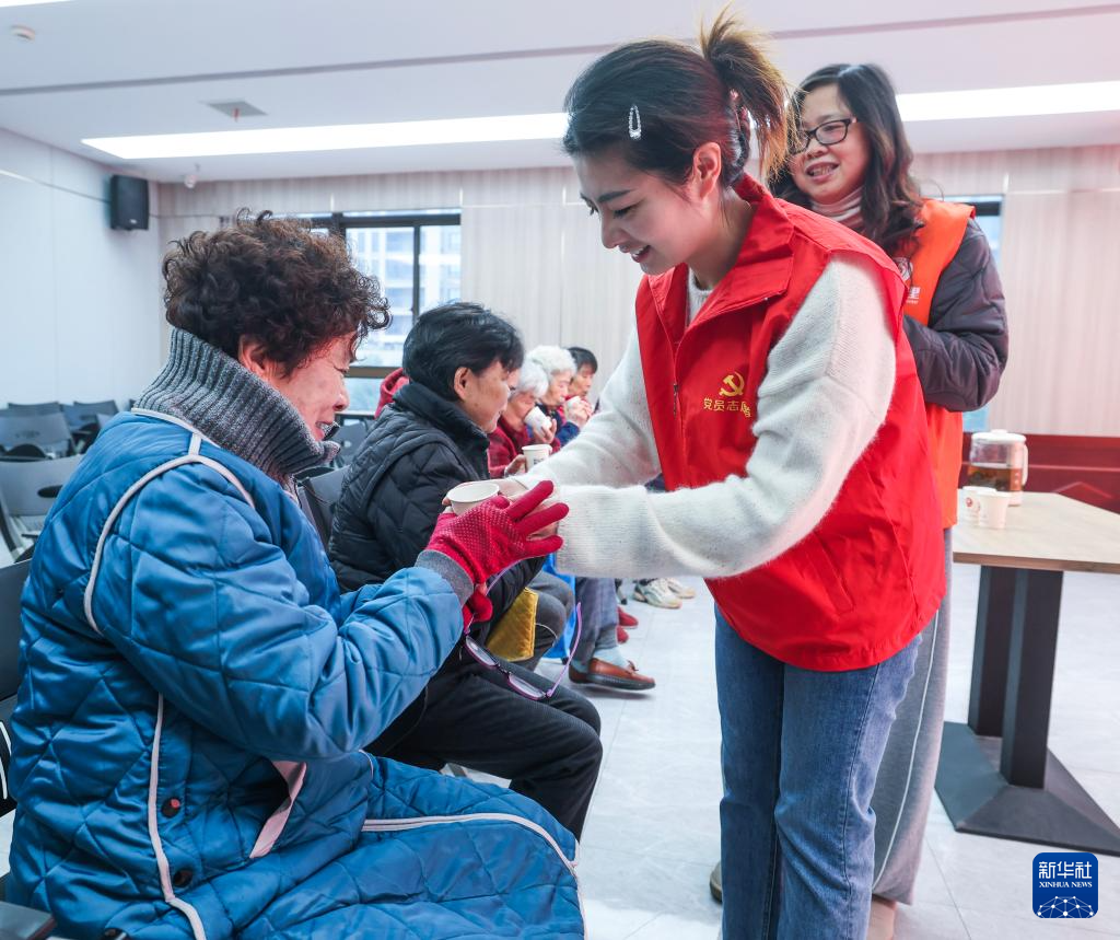 12月13日,在龙泉街道市陌河社区幸福邻里活动中心,志愿者为老年人送上祛风散寒的中药茶饮。