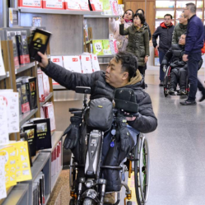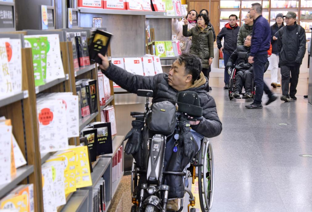12月13日,残疾人代表体验王府井书店内的无障碍书架。