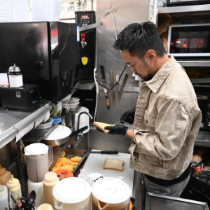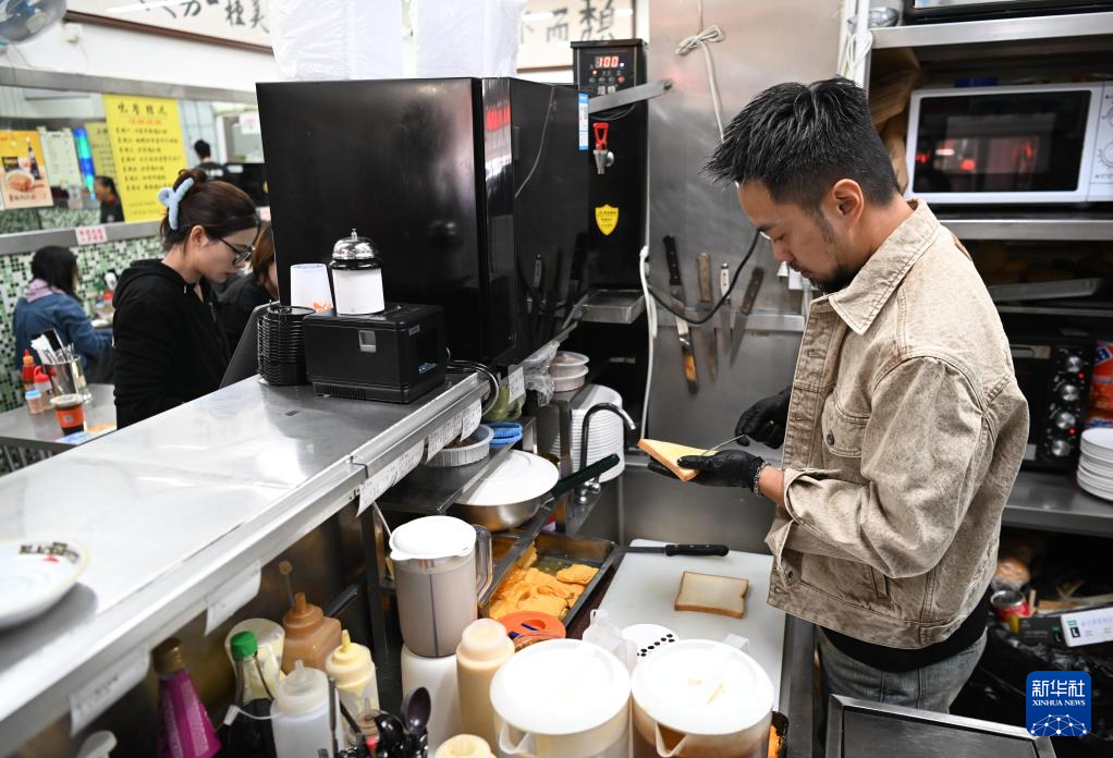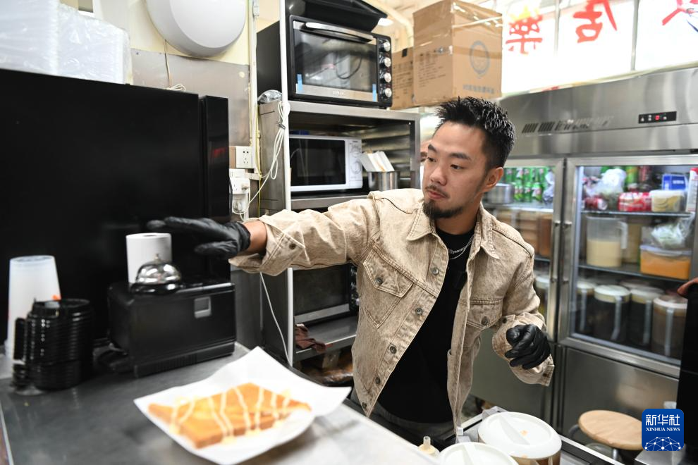 12月13日,邱志晖(右)在其创办的茶餐厅珠海夏湾店里制作三明治。