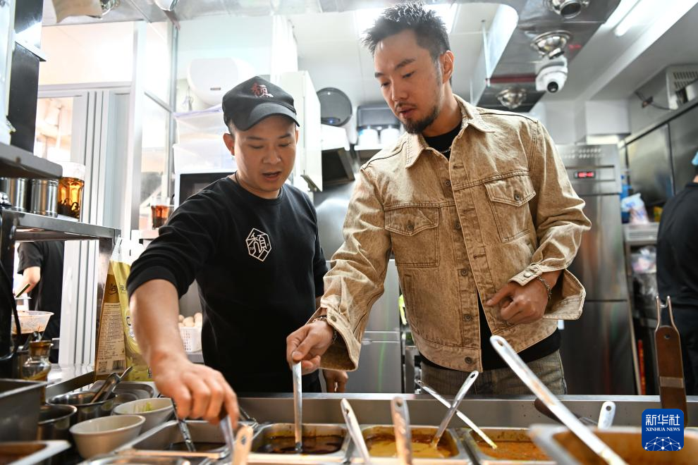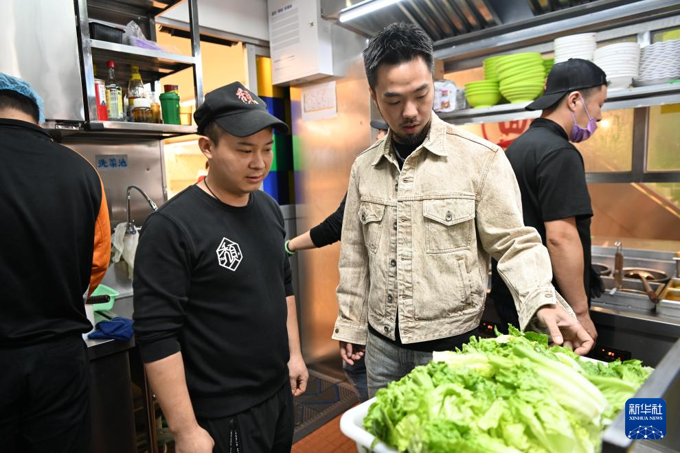 12月13日,邱志晖(右)在其创办的茶餐厅里查看菜品酱料。
