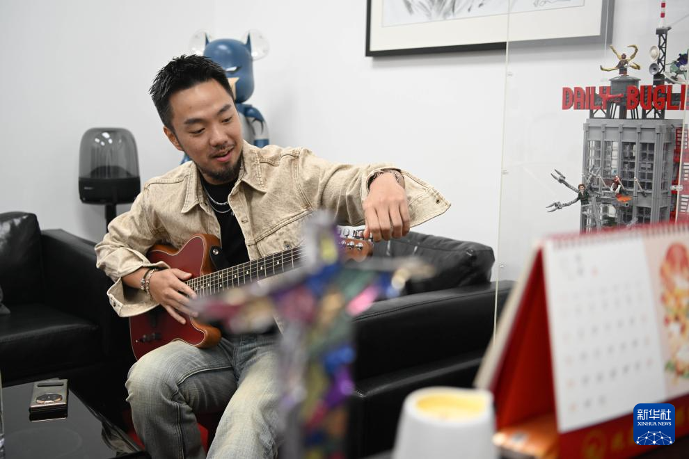 12月13日,邱志晖在珠海的办公室内调试吉他。