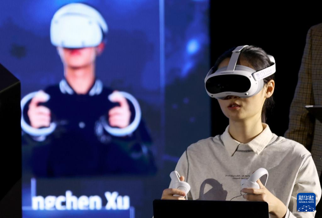 12月12日,在英国伦敦,一名女子参加智慧教育典型应用场景展示活动。