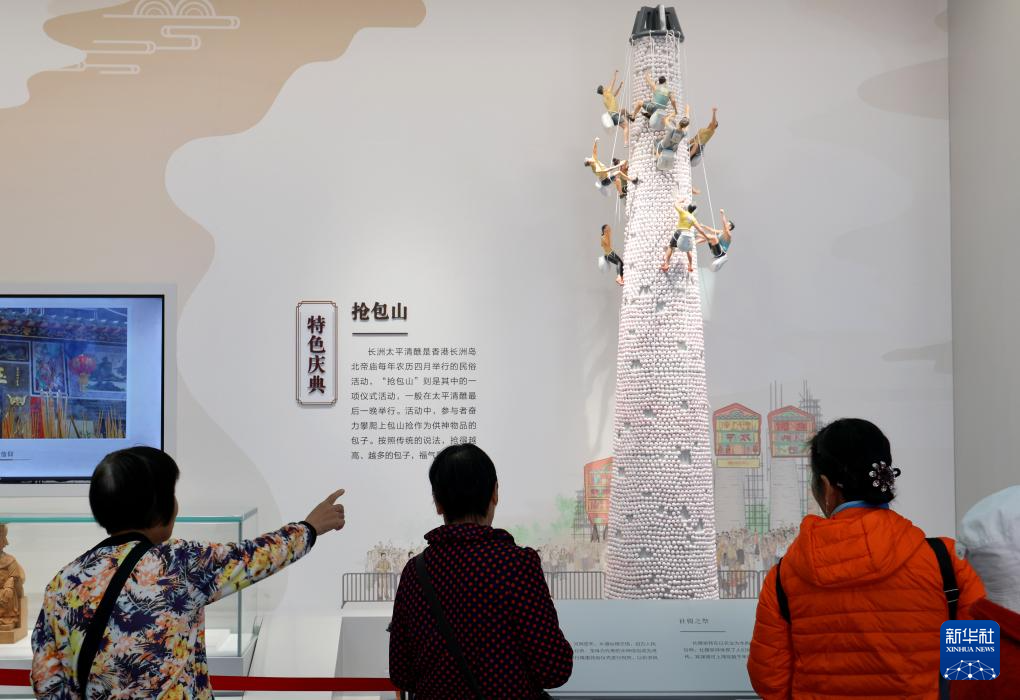 在广东省非物质文化遗产馆里,香港传统庆典活动“抢包山”模型吸引了游客的目光(12月6日摄)。