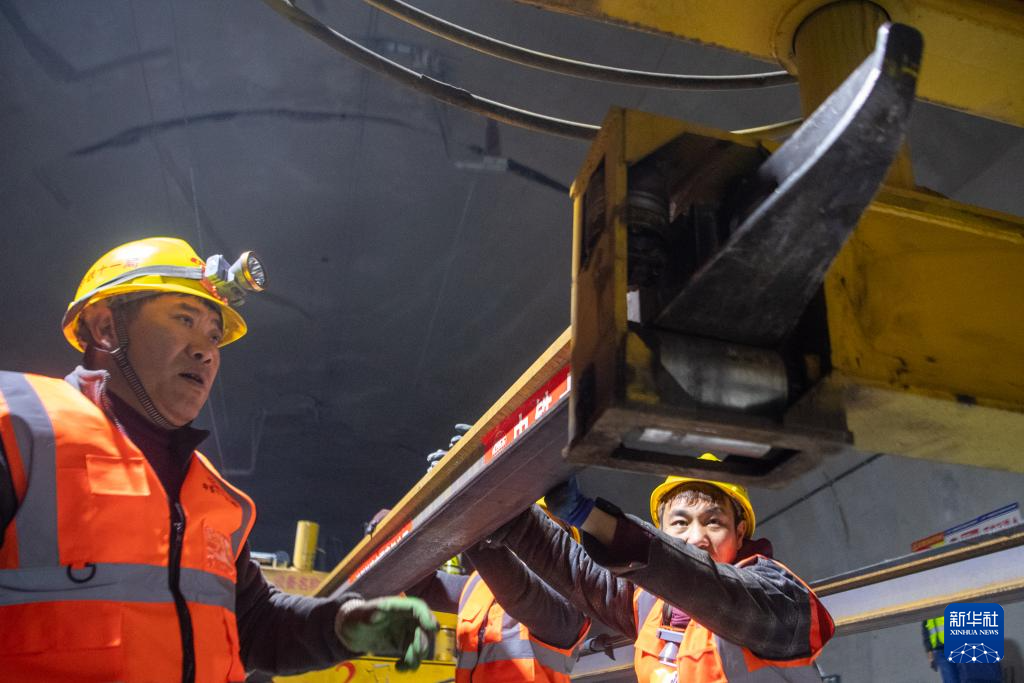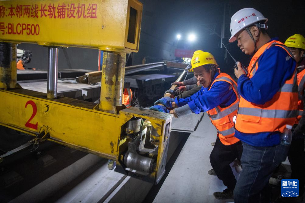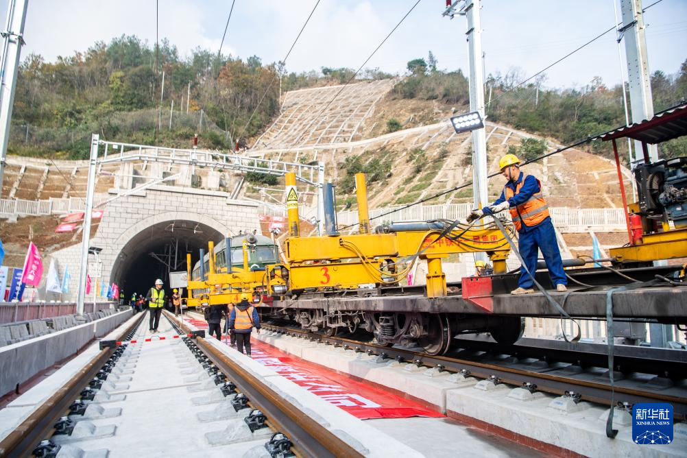 12月15日,工人在渝厦高铁重庆东至黔江段武隆区白马山隧道施工现场进行铺轨作业。