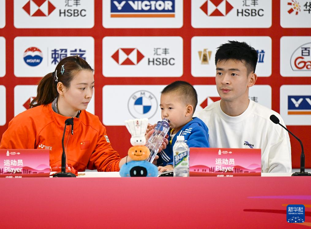 12月15日,郑思维(右)、黄雅琼(左)和郑思维的儿子在赛后新闻发布会上。