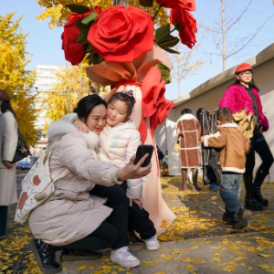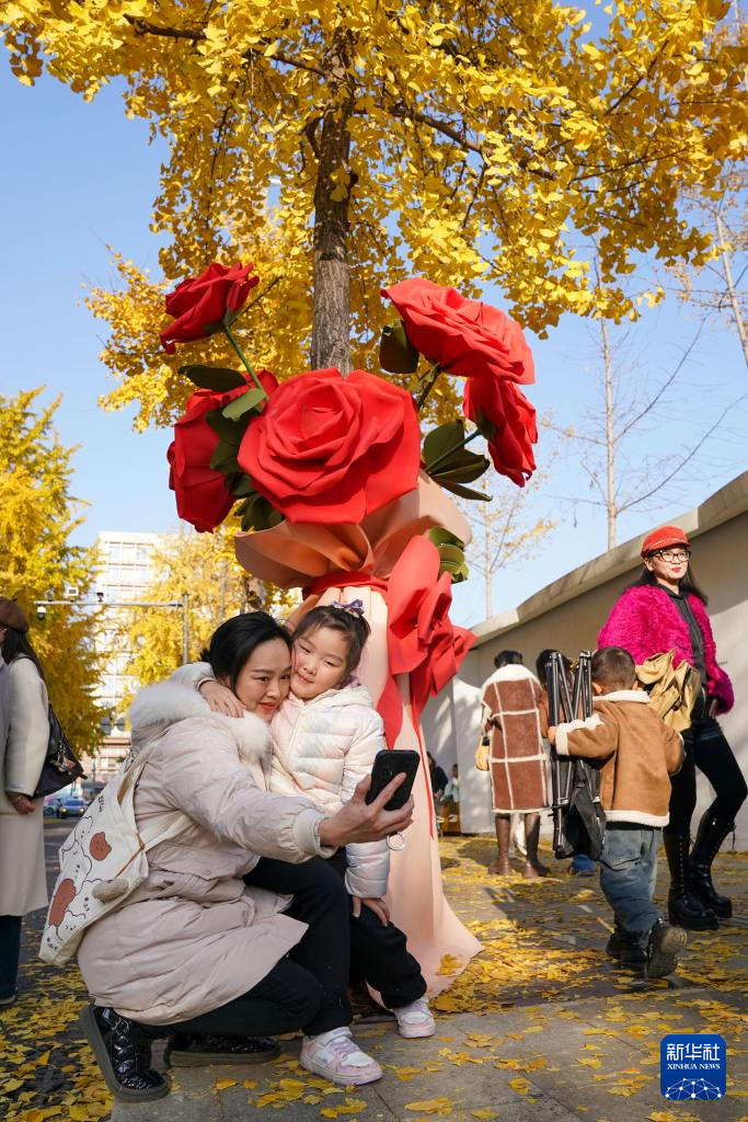 12月14日,一对母女在成都高新区兴蓉街银杏树下合影。