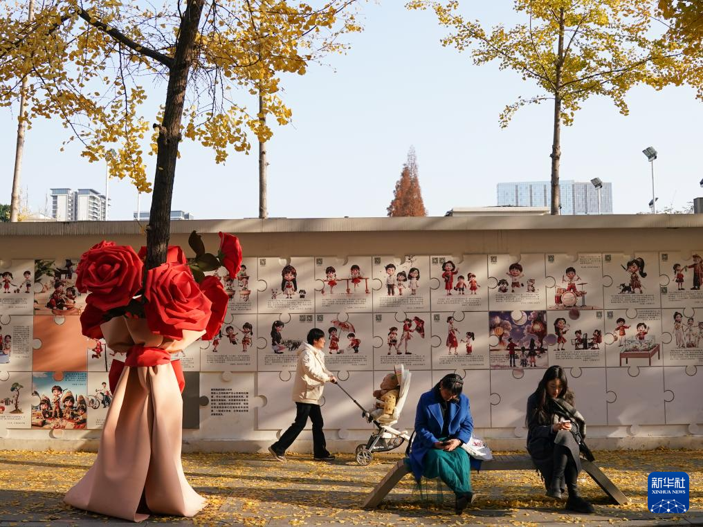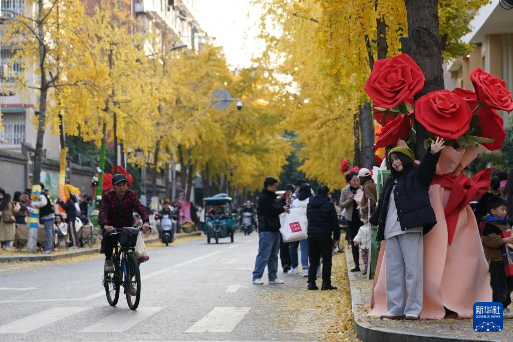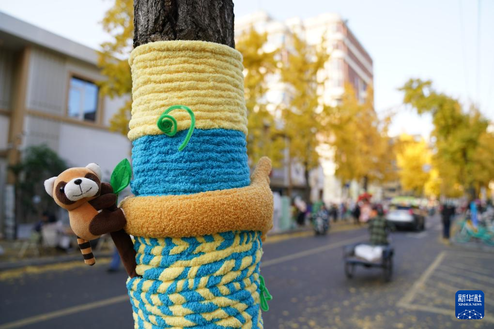 近日,成都街头银杏迎来最佳观赏期。在成都高新区肖家河街道兴蓉社区兴蓉街,居民和志愿者们一起,为路边30多棵银杏树穿上了“毛衣”,缤纷的色彩为冬日带来温暖,吸引了不少市民前来游玩拍照。