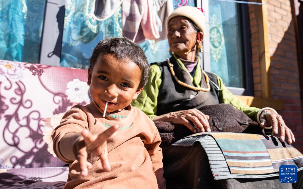 12月15日,达曼新村的孩子和老人在晒太阳。
