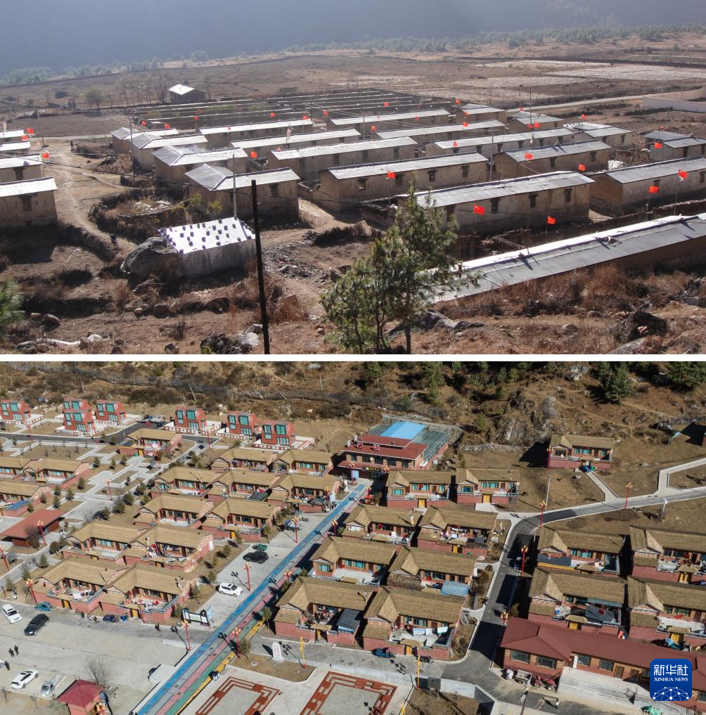 拼版照片,上图为:2005年拍摄的达曼新村(新华社发);下图为:2024年12月15日拍摄的达曼新村(无人机照片,新华社记者丁增尼达摄)。