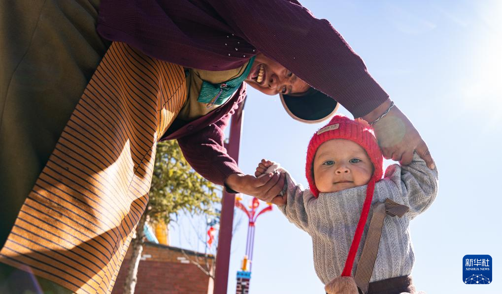 12月15日,达曼新村的一名妇女在教孩子走路。