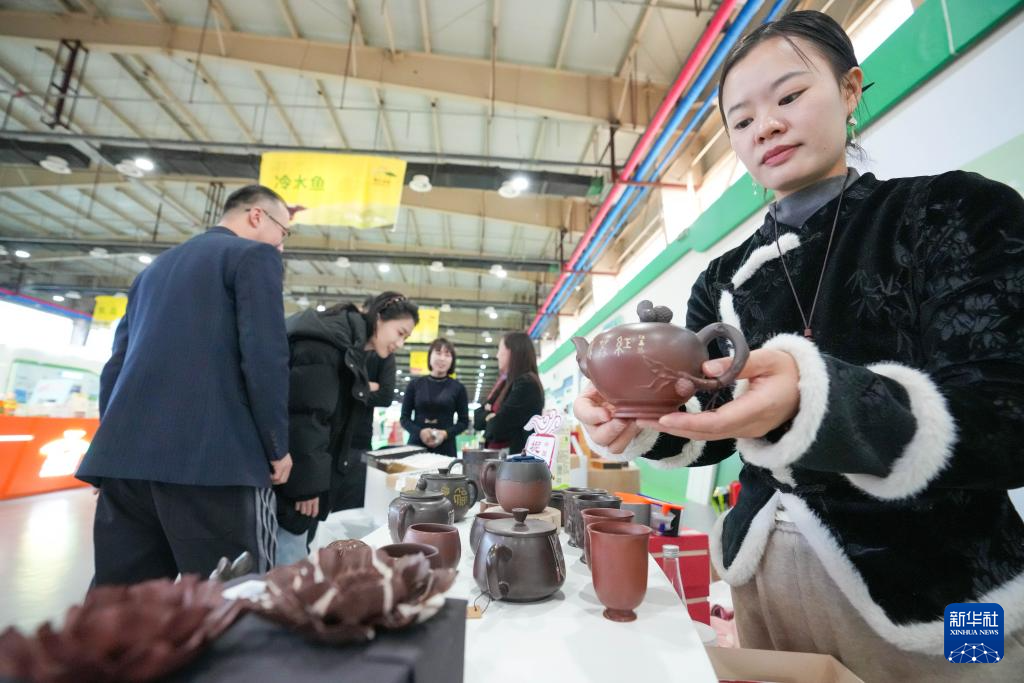 12月16日,工作人员在现场展示钦州坭兴陶茶壶。