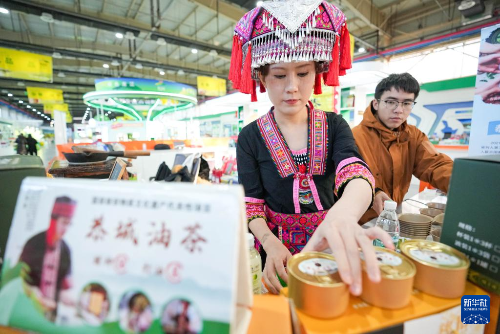 12月16日,在广西恭城瑶族自治县展位,工作人员在展示恭城油茶产品。