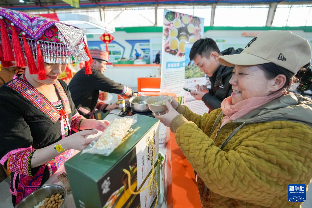 12月16日,在广西恭城瑶族自治县展位,市民在品尝恭城油茶。