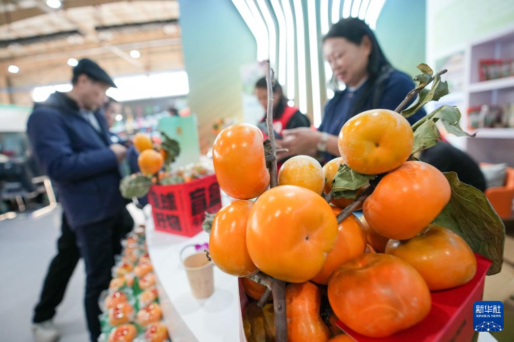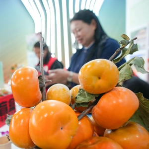 12月16日,在广西恭城瑶族自治县展位,市民在了解恭城月柿情况。