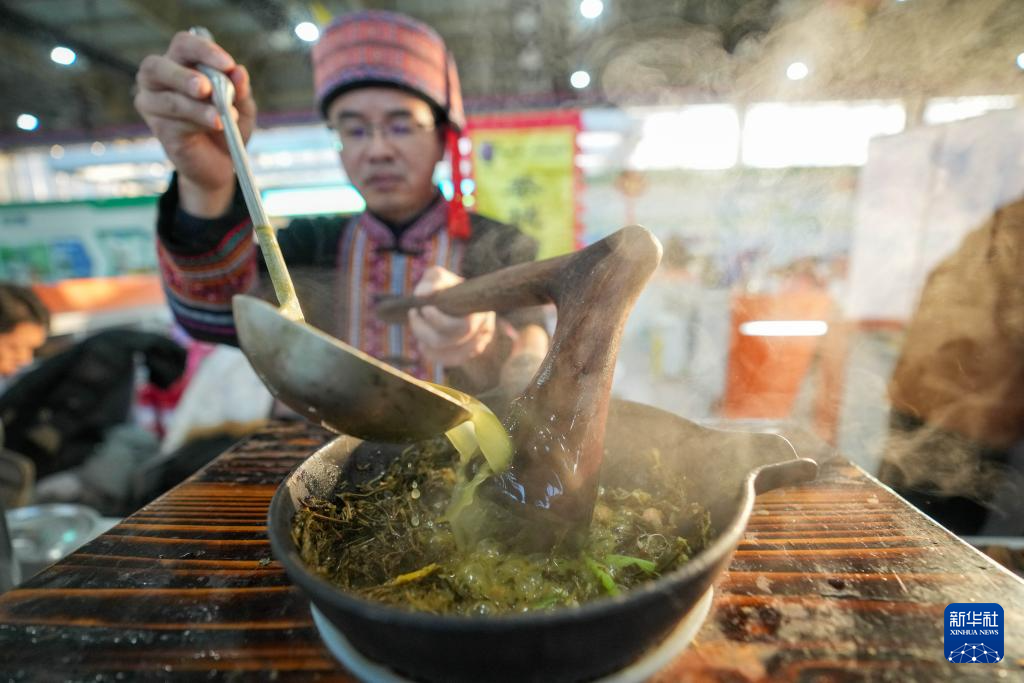 12月16日,在广西恭城瑶族自治县展位,非物质文化遗产项目“瑶族油茶习俗”代表性传承人周黎维在展示恭城油茶制作技艺。