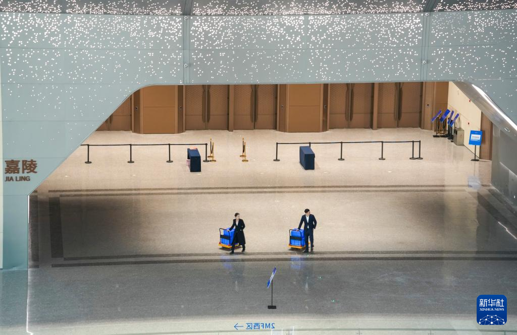 12月16日,在“中国重庆·科学会堂”内,工作人员进行试运营期间的会务准备工作(无人机照片)。