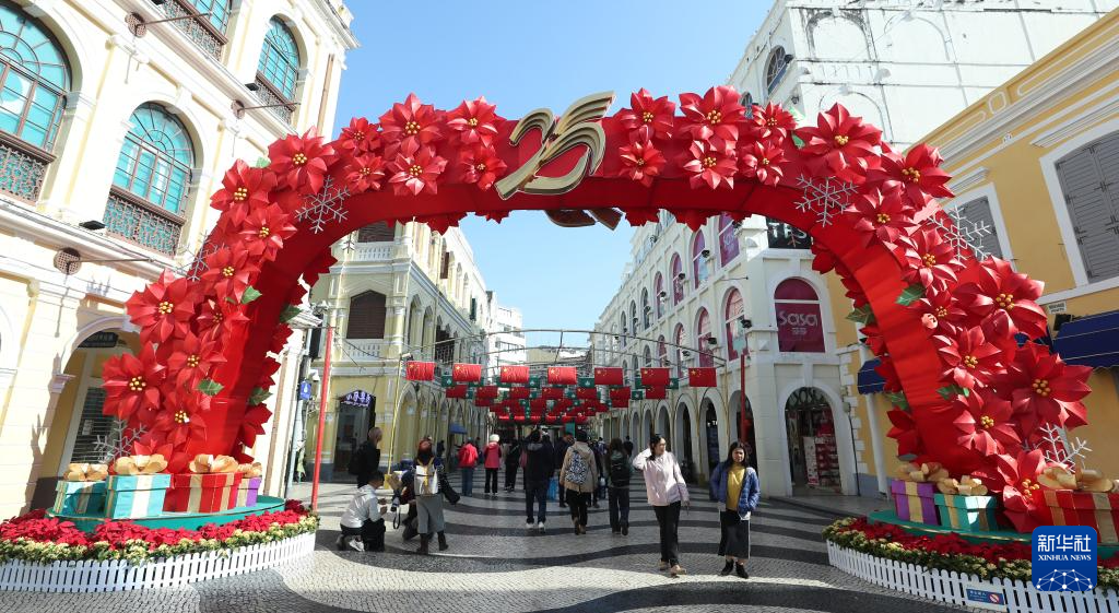 12月17日,行人经过澳门街头的庆祝海报。