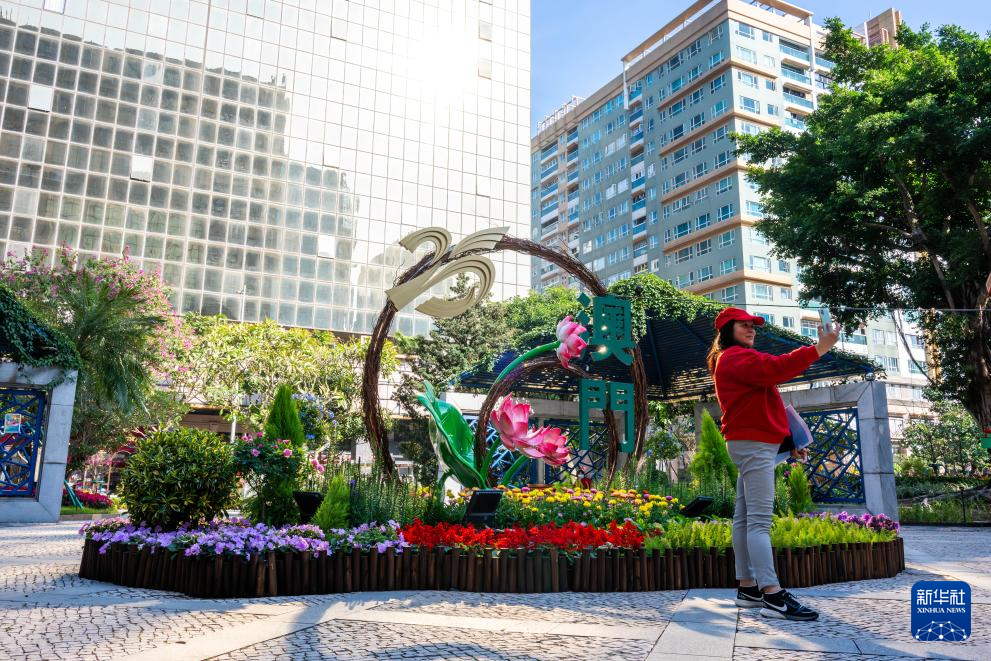 12月17日,市民在澳门一处庆祝花坛前拍照。