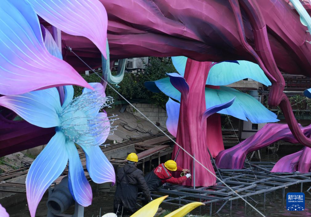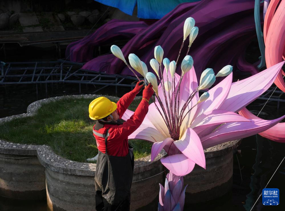 12月17日,施工人员在上海九曲桥边布置用于上海豫园灯会的灯组。