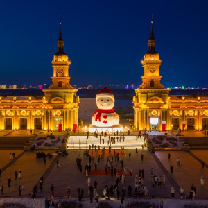 当日,哈尔滨“网红”大雪人“回归”松花江畔。