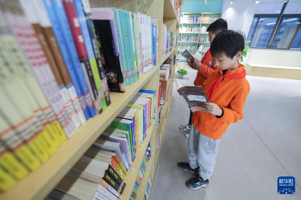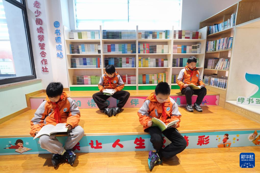 12月18日,学生在嘉兴市南湖区余新镇中心小学图书馆的“老少阅读攀登合作社图书漂流站”读书。