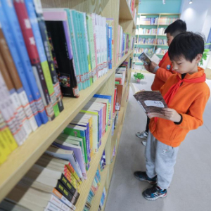 12月18日,学生们在嘉兴市南湖区余新镇中心小学图书馆的“老少阅读攀登合作社图书漂流站”读书。