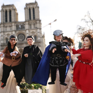 12月15日,在法国巴黎圣母院前,来自中国福建展演团的演员表演布袋木偶戏《巴黎圣母院》。