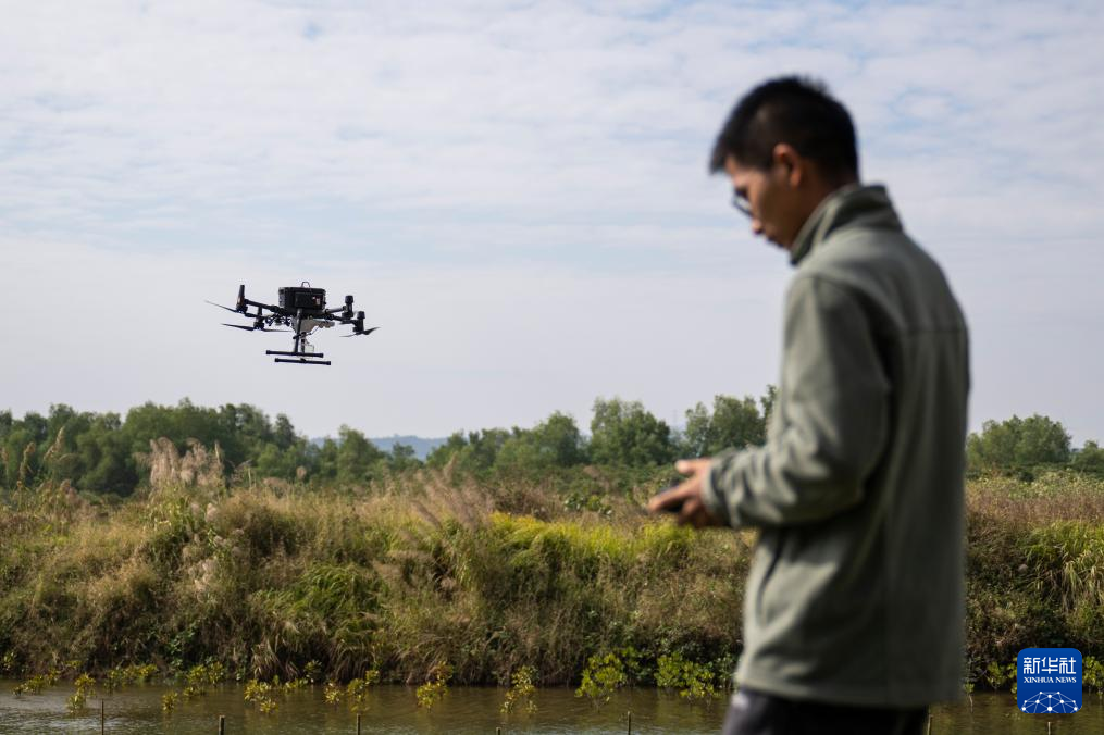 12月18日,在广东台山镇海湾红树林国家湿地公园的红树林种植-生态养殖耦合示范项目区,工作人员操作无人机采集水样。