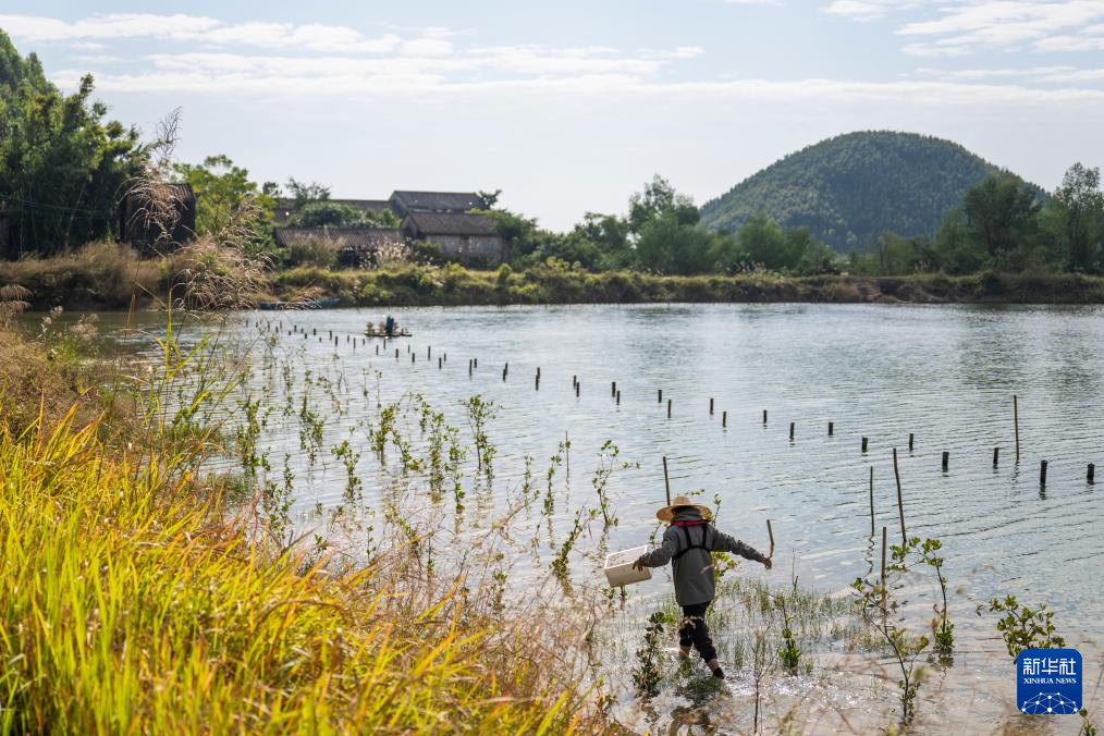12月18日,在广东台山镇海湾红树林国家湿地公园的红树林种植-生态养殖耦合示范项目区,工作人员涉水进行取样工作。