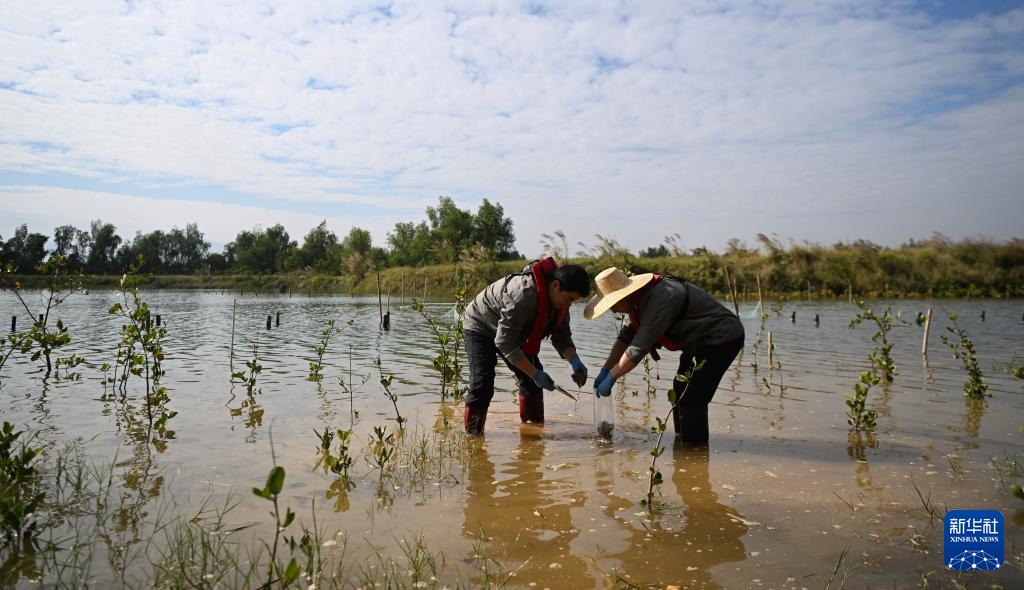 12月18日,在广东台山镇海湾红树林国家湿地公园的红树林种植-生态养殖耦合示范项目区,工作人员在采集土样。