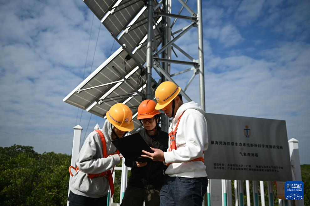 12月18日,在广东台山镇海湾红树林国家湿地公园,香港科技大学(广州)地球与海洋大气科学学域迟进舒课题组在查看气象观测塔数据。