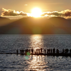 12月20日,游客在云南大理市大理镇洱海观看日出(无人机照片)。