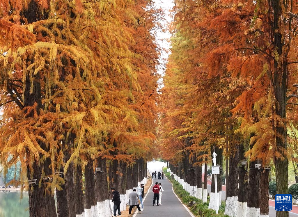 12月19日,市民在湖南省衡阳市雁峰区一处水杉林游玩(无人机照片)。